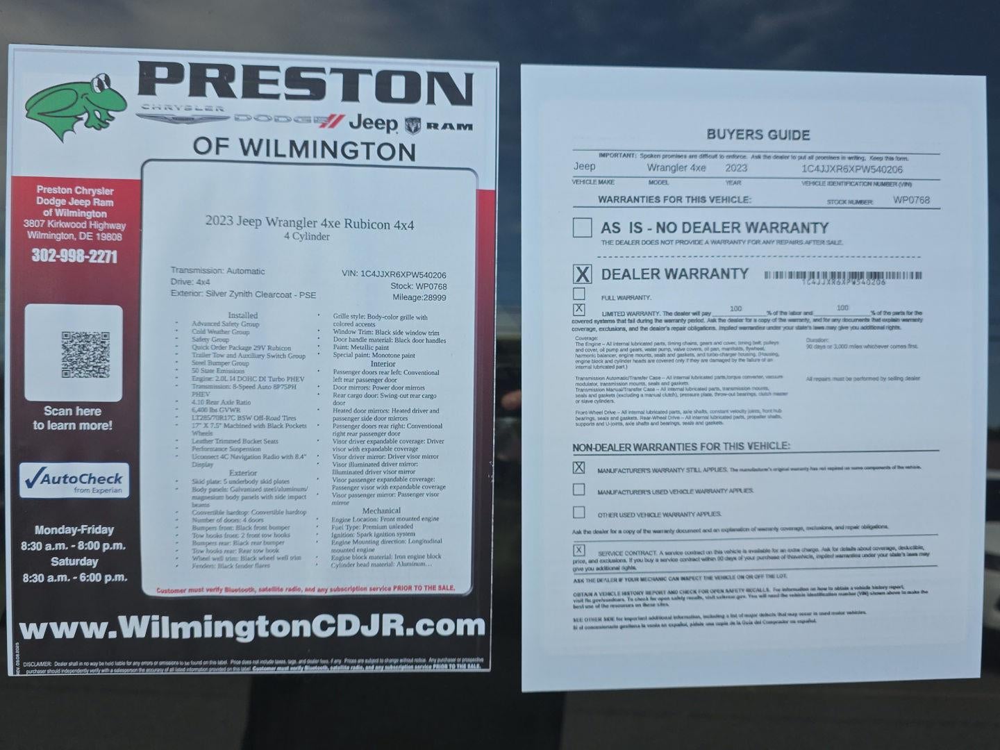 ENGINE: 2.0L I4 DOHC DI TURBO PHEV, TRANSMISSION: 8-SPEED AUTO 8P75PH PHEV, QUICK ORDER PACKAGE 29V RUBICON, TIRES: LT285/70R17C BSW OFF-ROAD, SILVER ZYNITH CLEARCOAT, DARK SADDLE/BLACK, LEATHER TRIMMED BUCKET SEATS, ADVANCED SAFETY GROUP, COLD WEATHER GROUP, SAFETY GROUP, STEEL BUMPER GROUP, TRAILER TOW & AUX SWITCH GROUP, SKY 1-TOUCH POWER TOP, FRONT LICENSE PLATE BRACKET, MOPAR ALL-WEATHER FLOOR MATS, INTEGRATED OFF-ROAD CAMERA